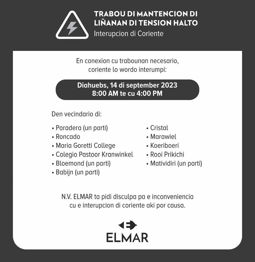 Esaki ta dura te cu dia 30 di september 2023. Si pa dia 9 di october 2023 no haya e pago di Arubalening por tuma contacto cu nos departamento, via e-mail na arubalening@ea.aw of via Whatsapp nr 594-4140..