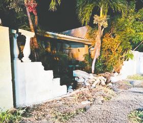 Ey ta unda e la subi acera na su man drechi y casi ta kibra cura di e cas ey, pero e ta maniobra unda e auto a kita bay na su man robes