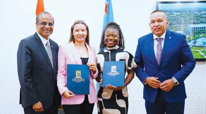 Dialuna mainta, durante Conferencia di Prensa di Gobierno di Aruba, Minister Endy Croes hunto cu Presidente di Xavier University School of Medicine Sr. Ravi Bhooplapur, dr. Arun Dubey, dr. Kevin Pawlak y Sr. Frank Croes a otroga dos (2) beca (scholarship) na dos (2) studiante Arubiano, esta Darlene Dol y Vanya Tromp. Ambos studiante a haya 100% beca (scholarship) pa studia medicina na Xavier University School of Medicine na Aruba. Pues, esaki ta significa cu ambos studiante no mester paga tarifa di scol (schoolgeld). Ta importante pa remarca cu cada beca ta balora na e suma di $189.000.