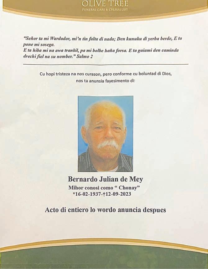 Y demas famia ta invita tur amigo, bisiña, conocir y coleganan di CMB pa asisti na e acto di condolencia y despedida cual lo tuma lugar diahuebs 21 di september 2023 na Aurora Funeral Home di 1:00 pa 4:00 pm, sigi pa e acto di cremacvion den seno di famia.