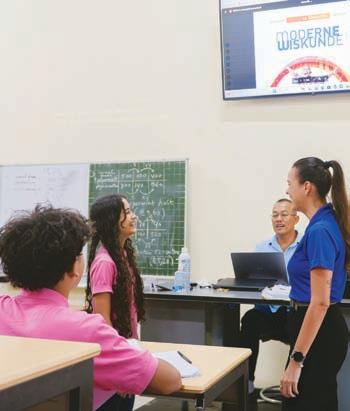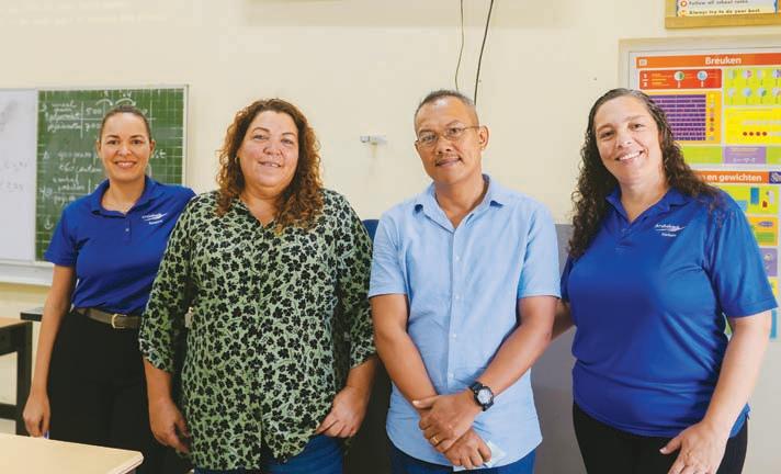 Representantenan di mercadeo dia Aruba Bank, Roxanne Croes y Nelleke Cardenas a bishita e scol y presencia e bon uzo di e screen durante les di wiskunde.