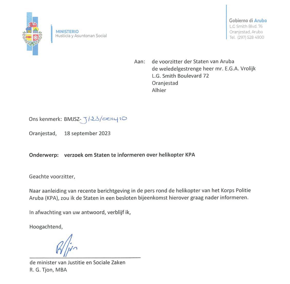 Minister rocco tjon a clarifica asunto di helicopter