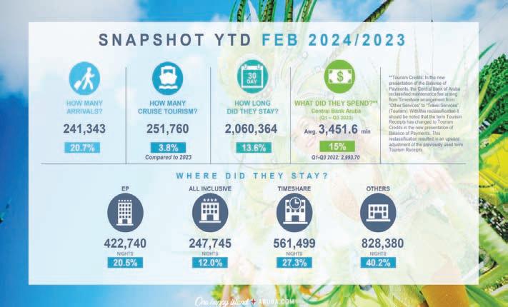 Den februari 2024, 81.3% di e total di e bishitantenan “stayover” pa Aruba a bishita for di Norte America, 5.1% a bishita for di Europa, 11.4% a bishita for di Latino America y 2.2% tawata procedente di otro partinan di mundo.
