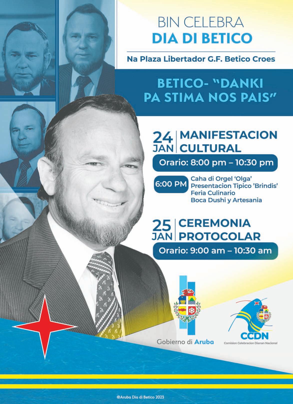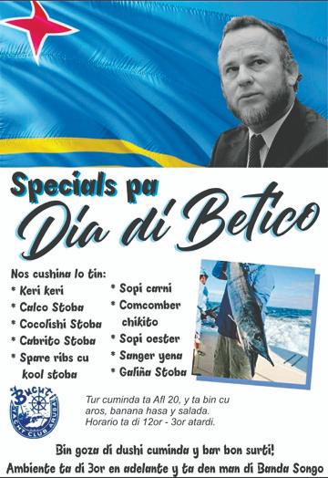 Banco Central, Procurador General etc. Ta pesey e homenahe y gratitud di mas grandi cu nos pueblo Arubano por duna Betico ta di hisa nos bandera y canta e himno Arubano riba Dia di Betico, esta diaranson awor.