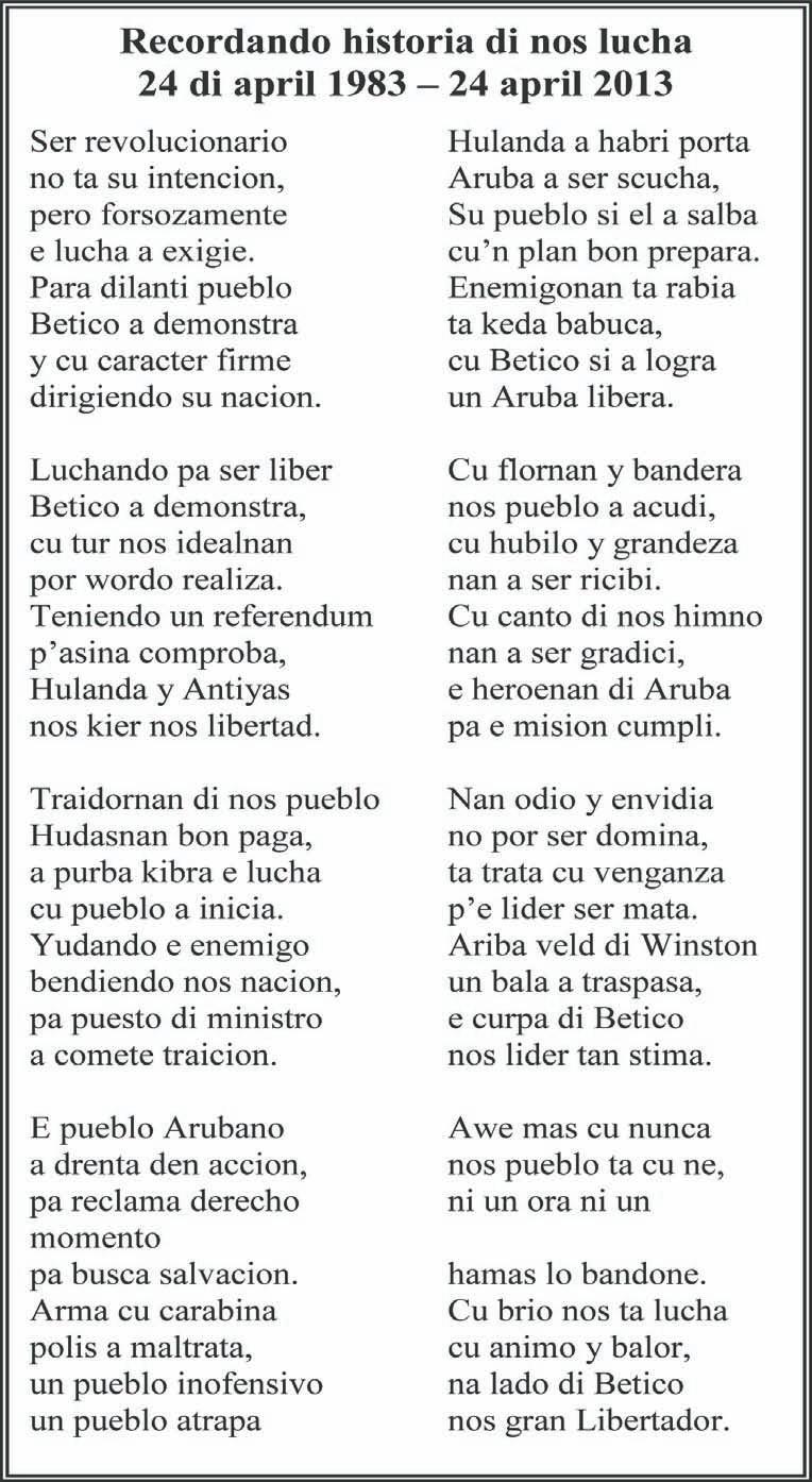 Pabien pueblo balente, dichoso bo ta pa a biba e momentonan historico ey hunto cu nos. Dios duna, cu nos yiunan y yiu di nan yiunan, lo sa di balora e trabaonan di e Arubianonan balente aki. Na tur cu a bay laga nos caba, nos ta spera cu den Reino di Dios nan por ta contento di a haci historia y logra cosnan grandi pa nan Pueblo. Nos lo recorda nan pa semper, como soldanan den promer fila di e lucha y como esnan cu a corona esaki cu exito. Ban nos tur proteha nos autonomia y respeta nos himno, bandera, ortografia, folklore y nos cultura. Ban defende e identidad Arubiano y conserva e balornan spiritual di un isla chikito di tamaño, pero noble y grandi di curazon, digno di ta un pais soberano den Reino Hulandes. Felis dia di Betico.