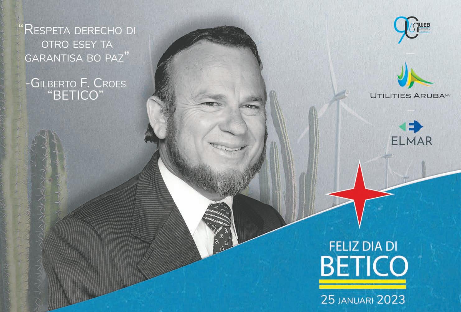 Dia 25 di januari, esta diaranson awor nos pueblo ta recorda e fecha di nacemento di nos lider inmortal Gilberto François (Betico) Croes den feliz memoria. Si Betico ta na bida, e lo a cumpli 85 aña. Tabata na aña 1994 cu e gobierno di e tempo ey, esta Gabinete Oduber II a decreta e fecha di 25 di januari como un dia oficial di Aruba; un fecha cu mester sirbi como reflexion pa e generacion aki y e futuro generacionnan keda recorda e gran estadista y luchador incansabel di e causa Arubano. Poco ta e politiconan den mundo cu Dios Todopoderoso ta manda cu un mision pa cumpli cu ne a base di nan talentonan special. Betico tabata un di e politiconan ey cu Dios a manda pa nos, un berdadero patriota y sirbidor di pueblo.