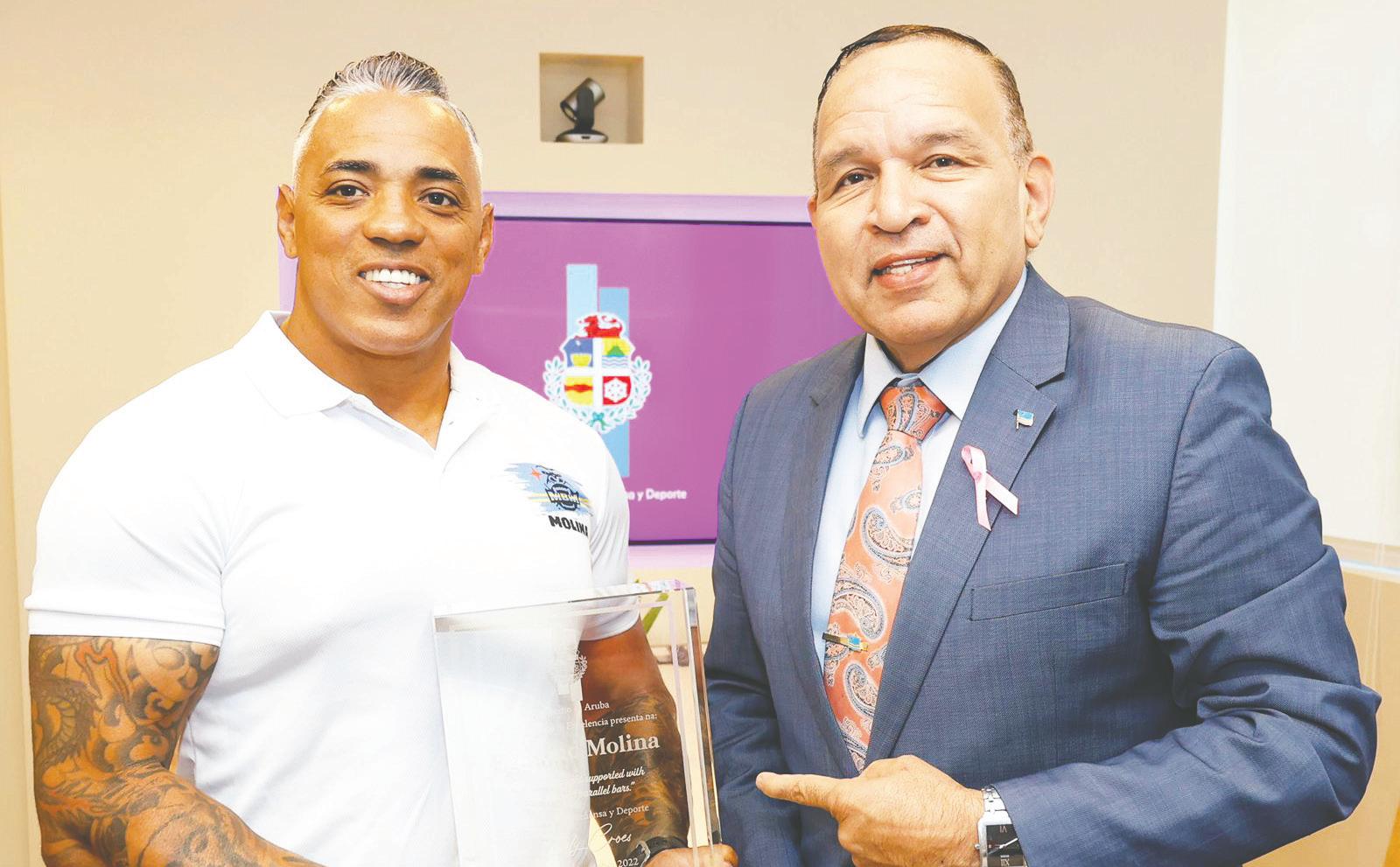 Pa cu e gran logro aki y den nomber di Gobierno di Aruba, Minister di Deporte Endy Croes a reconoce atleta Egmond Molina cu un reconocemento di