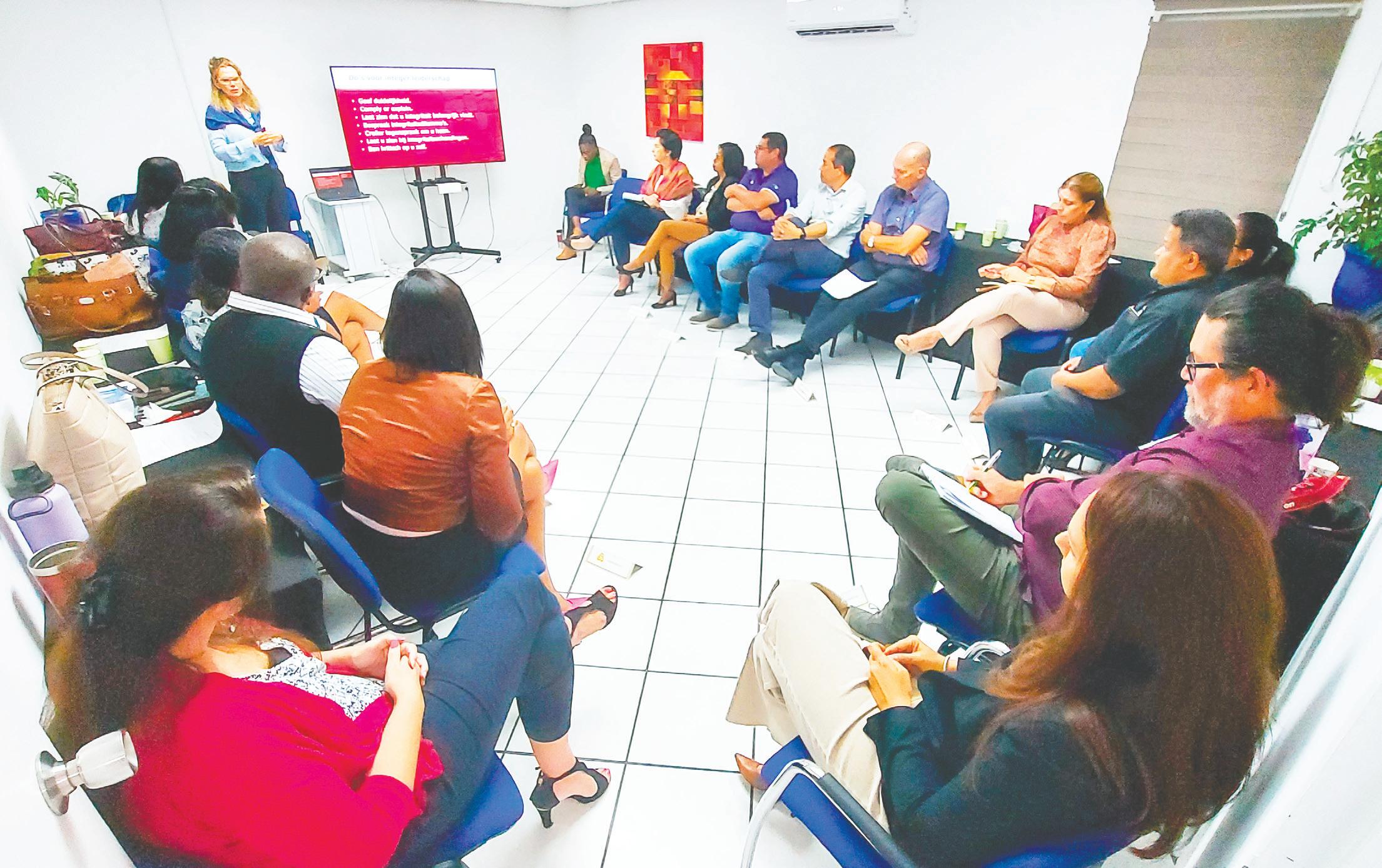 Durante e prome parti di e training a elabora riba caracteristicanan di comportamento humano y na un forma interactivo a duna atencion na e kompas moral encuanto balornan cu ta importante na trabou. Despues a continua riba desaroyo local y internacional riba e tema di integridad y e tarea y ehempel specifico cu tur hefe di departamento tin. Al final a caba e training cu diferente caso practico relaciona cu integridad. E parti di e training aki a duna e participantenan e espacio pa delibera riba posibel solucion y a pone enfasis con por minimalisa e risico di violacion di integridad na pia di trabou.