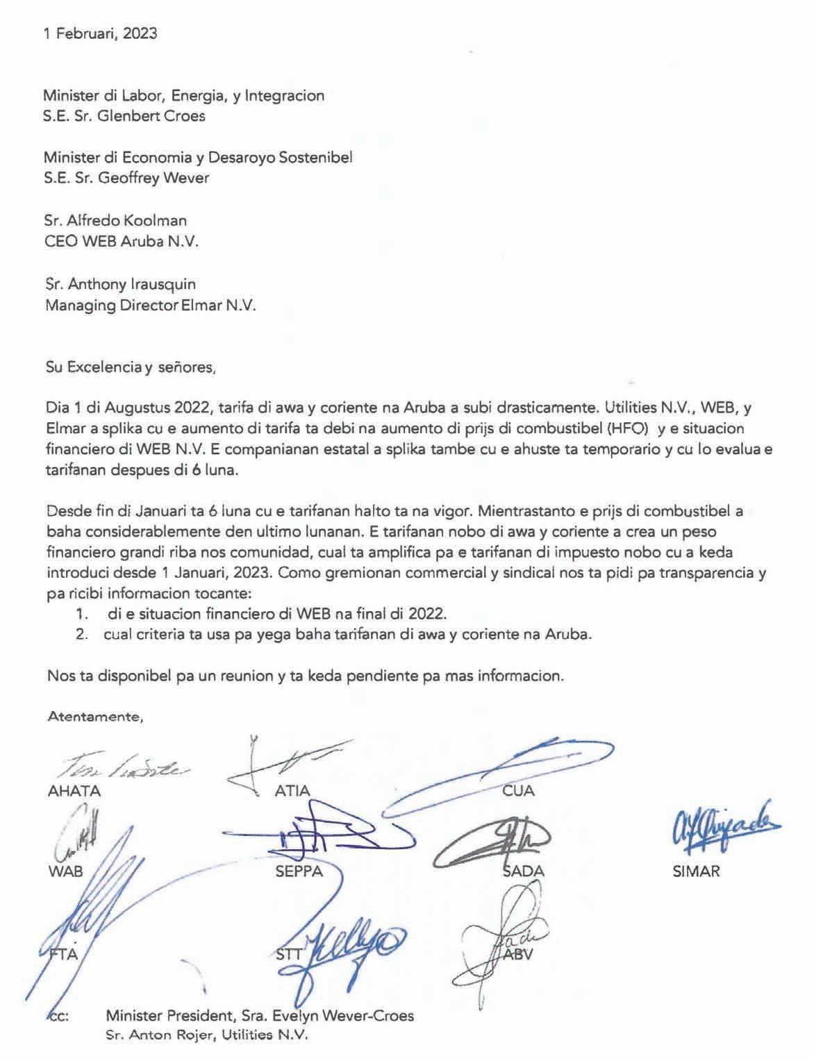 e deparatmento di RWZI. Unabes cu e departamento ta privatisa, lo traspasa esaki na Utlities Aruba NV. E plannan ta pa e prome kwartaal di e aña aki, pues mas tarda 31 di maart 2023 e traspaso wordo finalisa. Minister Ursell Arends y Minister Glenbert Croes ta esnan encarga pa negocia den nomber di Gobierno pa asina por yega na e traspaso.