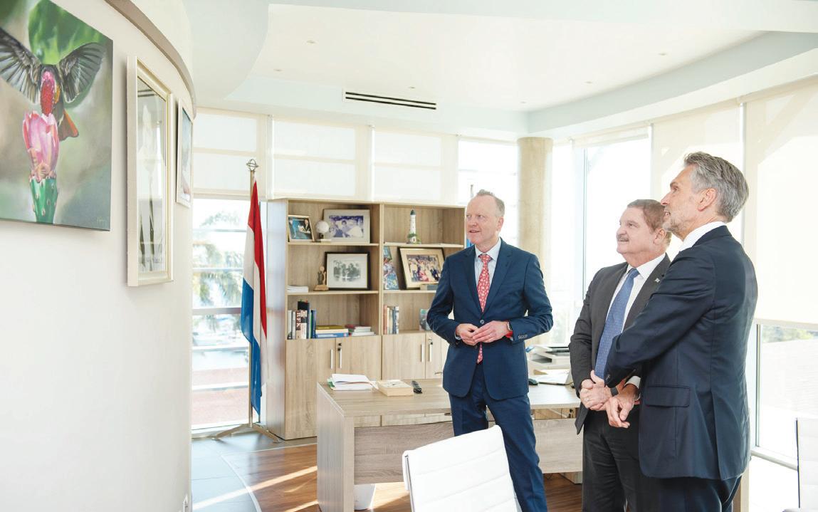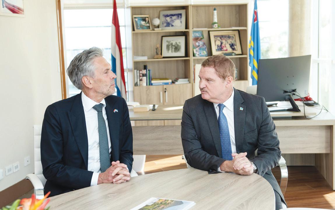 bestuurskantoor, en zetten het gesprek voort in de robuuste muren van Fort Zoutman,” aldus MinisterPresident Eman. “Van daaruit, ter hoogte van de Willem III-toren, keken we uit over de ontwikkeling van Aruba en het landschap dat zo vloeiend overgaat van aarde naar zee – een beeld dat ons vervulde met betrokkenheid en perspectief.”