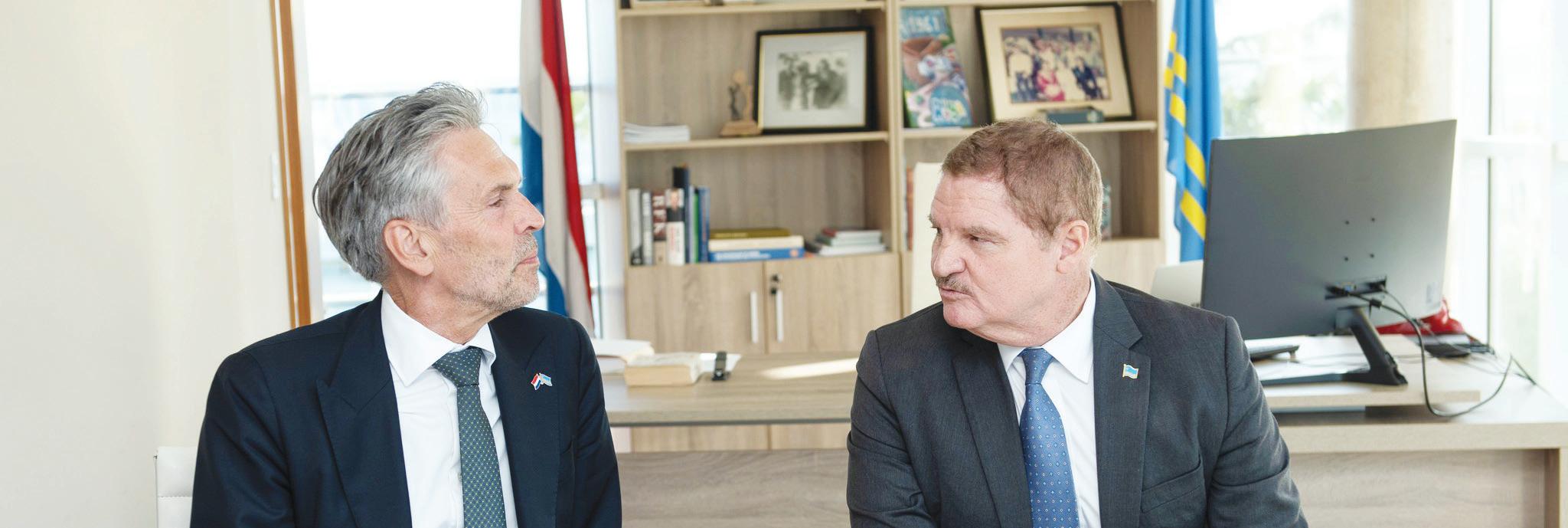 Oranjestad, 11 mei 2025 – Minister-President van Aruba, Mike Eman, ontving op 10 en 11 mei zijn Nederlandse ambtgenoot, Minister-President Dick Schoof, voor een tweedaags officieel bezoek aan Aruba. Het betrof Schoofs eerste bezoek aan het eiland sinds zijn aantreden als regeringsleider van het Koninkrijk der Nederlanden en vond plaats in een sfeer van openheid, vertrouwen en toekomstgerichte dialoog. Het bezoek begon in alle intimiteit in het bestuurskantoor van Aruba. Minister-President Eman ontving zijn collega in zijn werkkamer, waar hij hem een foto toonde van zijn onlangs overleden broer, Henny Eman – de eerste premier van Land