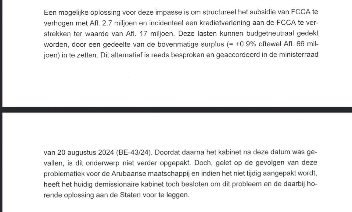 Cu asombro nos a tuma nota di un comunicado di sr. Bermudez di AVP tocante FCCA. sr. Bermudez ta bisa cu 6 di maart a entrega e nota di cambio pa aloca e fondonan pa FCCA, despues cu a perde eleccion. Sr. Bermudez a expresa lo siguiente: “Si bo tabata kier FCCA asina bon, si e ta na bo pecho, si bo kier a mira cas social construi; bo por a mira pa FCCA haya placa na 2024 of na 2023, pero nunca FCCA tabata den bo interes.” Mi ta kere ta bon momento pa indica Sr. Bermudez ta na unda e tin cu lesa pa e por wak pa su mes cu e decision pa yuda FCCA a keda tuma ya for di medio 2024 caba!