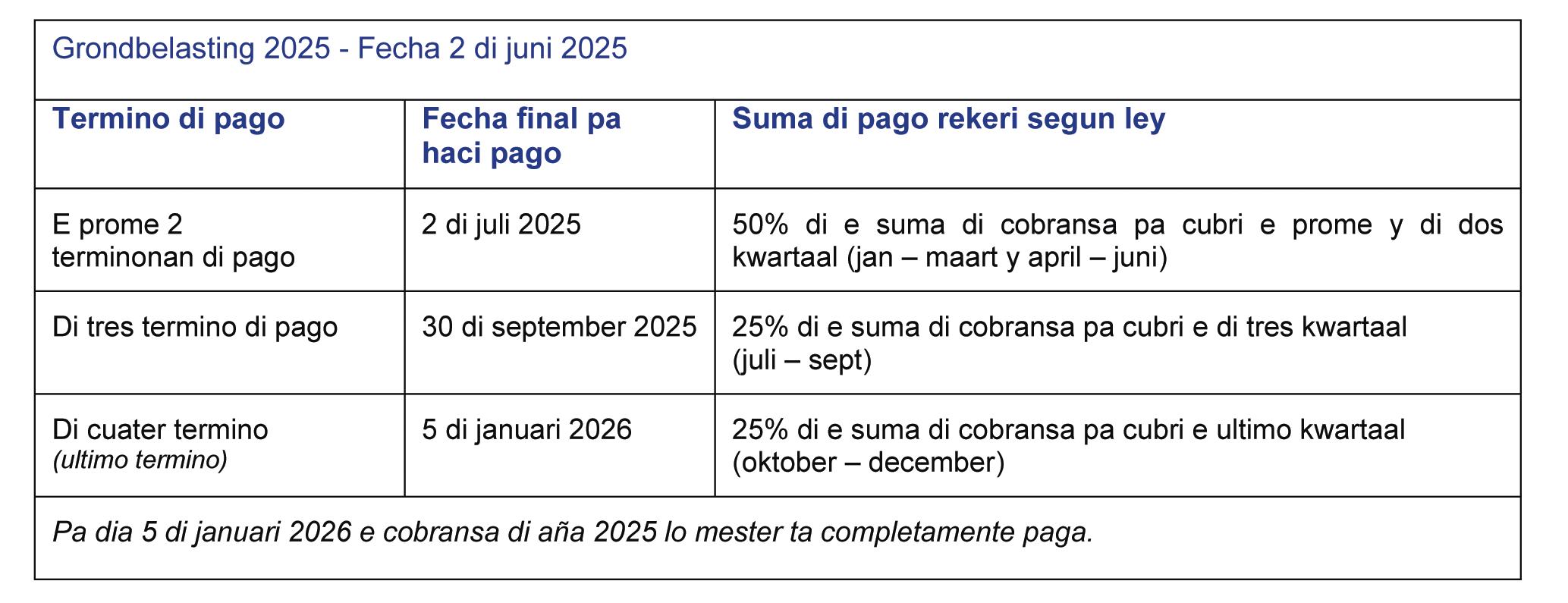 Grondbelasting 2025 - Fecha 2 di juni 2025 25% di e suma di cobransa pa cubri e ultimo kwartaal (oktober – december)