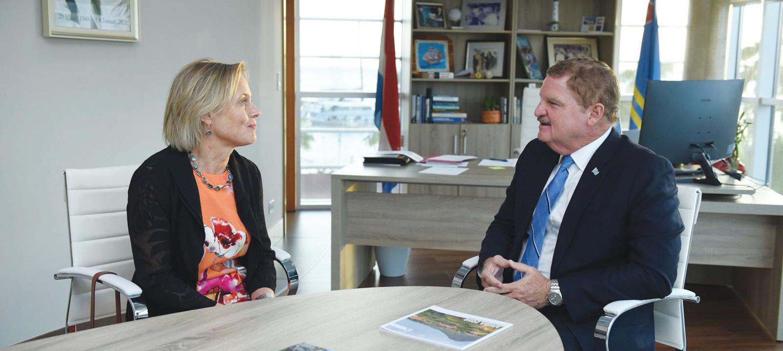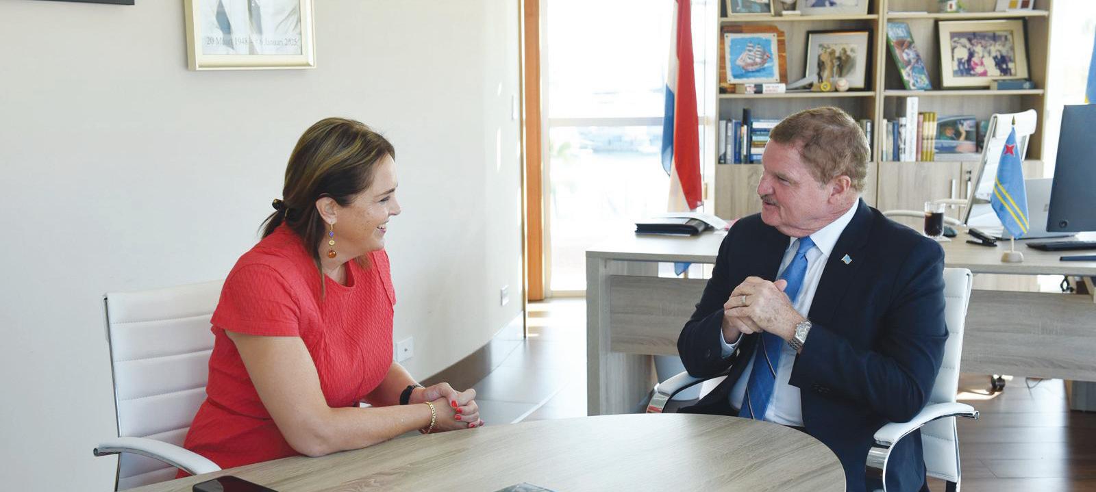 Prome Minister di Aruba, mr. Mike Eman, a ricibi na su kantoor, Dr. Bahia Tahzib-Lie, Representante Permanente Suplente di Reino Hulandes pa Nacionnan Uni na New York, Merca. E bishita a tuma luga den cuadro di e conferencia di embahadornan di Reino Hulandes cu ta tuma luga diabierna siman pasa.