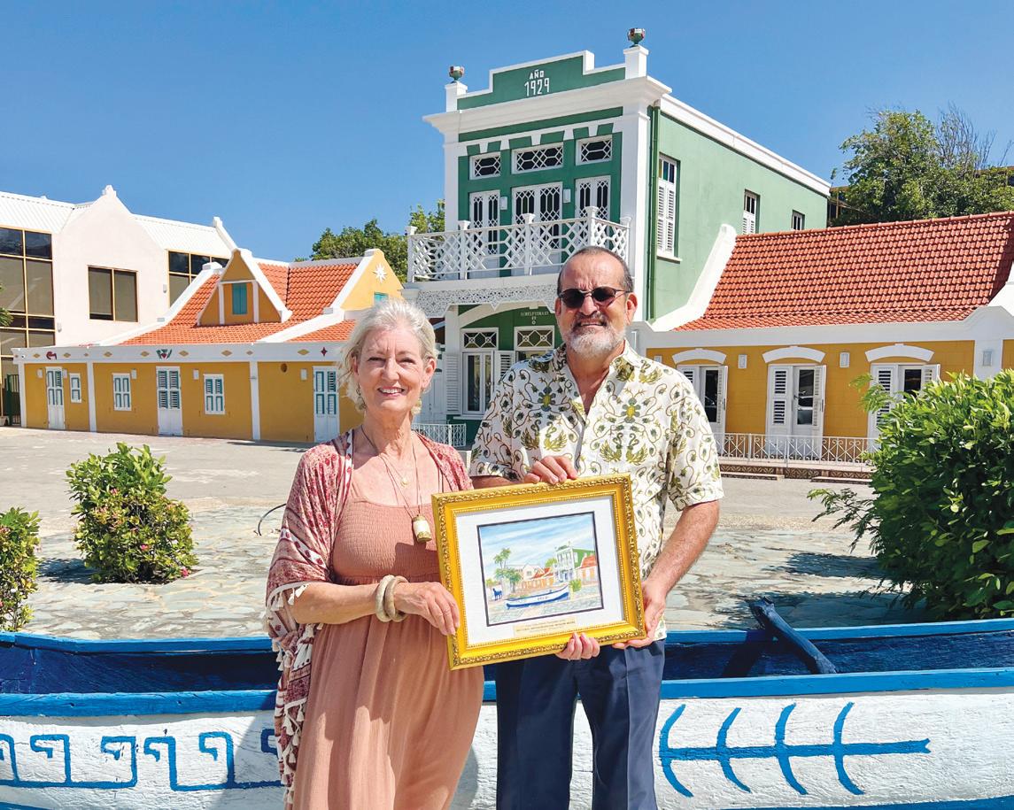 Leisa Collins, un artista reconoci di Estados Unidos kende ta enfoca riba pintamento di edificionan historico, a entrega su ultimo premiacion yama ‘Premio Leisa Collins pa Conservacion Historico’ na director interino di Museo Arqueologico Nacional Aruba (MANA), Pancho Geerman riba 28 di augustus 2025. E premio aki ta un reconocimento pa e contribucion spectacular di e museo na conservacion historico y cultural di Aruba y pa e servicio educacional cu ta enrikese