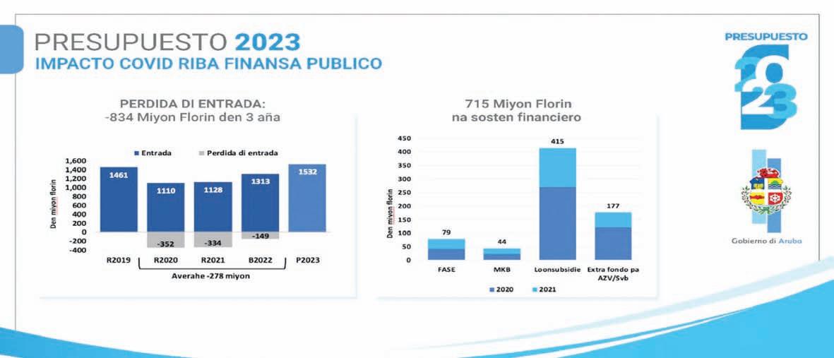 Na e momento ey, e perdida di entrada tawata 834 miyon florin. Aparte di e perdida di entrada considerable aki den e añanan 2020, 2021 y 2022, a bin gastonan acerca hopi grandi cu normalmente Gobierno no ta carga, entre otro Proyecto di FASE di 79 miyon florin; Proyecto pa sosten financiero pa prestamo mediano y chikito (MKB) di 44 miyon florin; subsidio di salario di 415 miyon florin; y a inverti 177 miyon florin extra pa mantene fondo di AZV y SVb solido. Pa logra tur esaki, Gobierno di Aruba mester a presta 916 miyon florin di Hulanda.