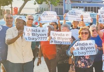 Wever Croes pa ranca 15 miyon flrin for di ELMAR y WEB. Nan ta sinti cu no por keda keto mas pa e manera con Gabinete WeverCroes II kier plunder Pais Aruba y su companianan pa sigui cu nan abusonan y sigui beneficia nan mes. Para dilanti di sede di N.V. Elmar na Playa, lider di AVP cu un grupo di ciudadano a demostra cu documento y recibo den man, pakico nan y pueblo tin tur motibo di ta disgusta cu e gobierno di MEP y RAIZ. Esaki ta e mes un sentimento cu, te hasta, e propio Raad van Advies, ta expresa relaciona cu e intencion di gobierno di saca 15 miyon florin for di e companianan di utilidad WEB y ELMAR.