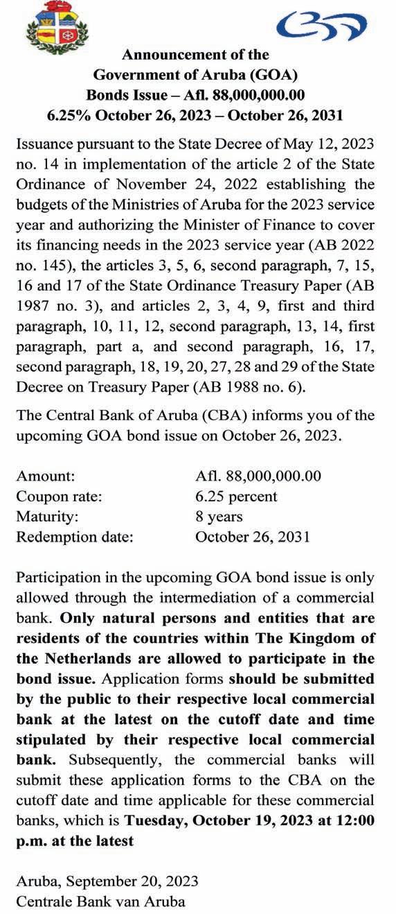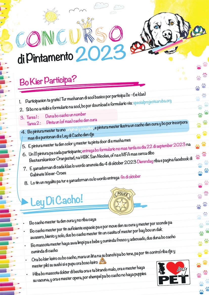 Ultimo dia cu por entrega e formularionan di participacion ta diabierna dia 22 di september 2023. Por entrega e formularionan na Bestuurskantoor Oranjestad, na HBK San Nicolas of na e MFA mas cerca.