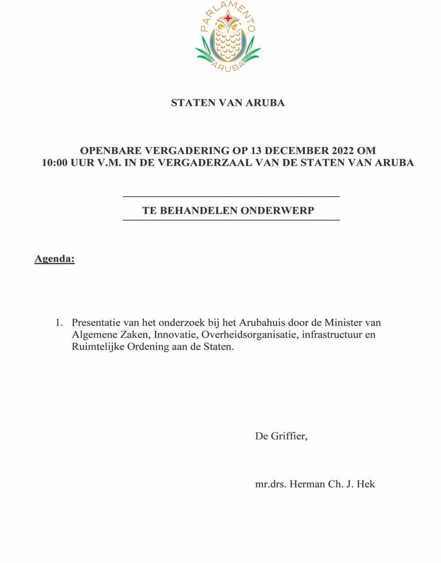 Diamars 13 di december, Prome Minister Evelyn Wever-Croes, señor Pang di Centraal Accountants Dienst (CAD) y señor Wernet di DRH tawata den Parlamento den reunion publico pa duna informacion y presentacion riba e tema Arubahuis. Esaki, Prome Minister a remarca, ta un tema cu desde cu a cuminsa cu ne, a hala hopi atencion, hasta atencion politico, den sala di Parlamento y den varios ocacion a ricibi cartanan di Parlamento pidiendo pa mas informacion. Gobierno a indica cu ta importante pa e investigacion wordo haci y pa no stroba e investigacion mes.