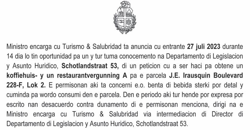 Premionan ta wordo anuncia dia 15 di Augustus 2023. Tira e coupon aki den buzon na oficina di Solo di Pueblo na Sta Cruz 110, solamente entre 2or di atardi cu 4or di atardi.