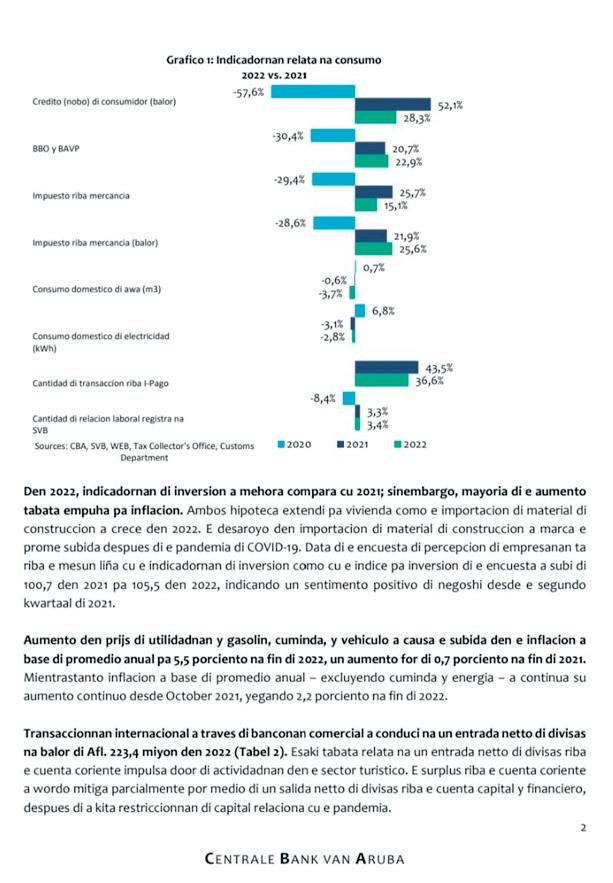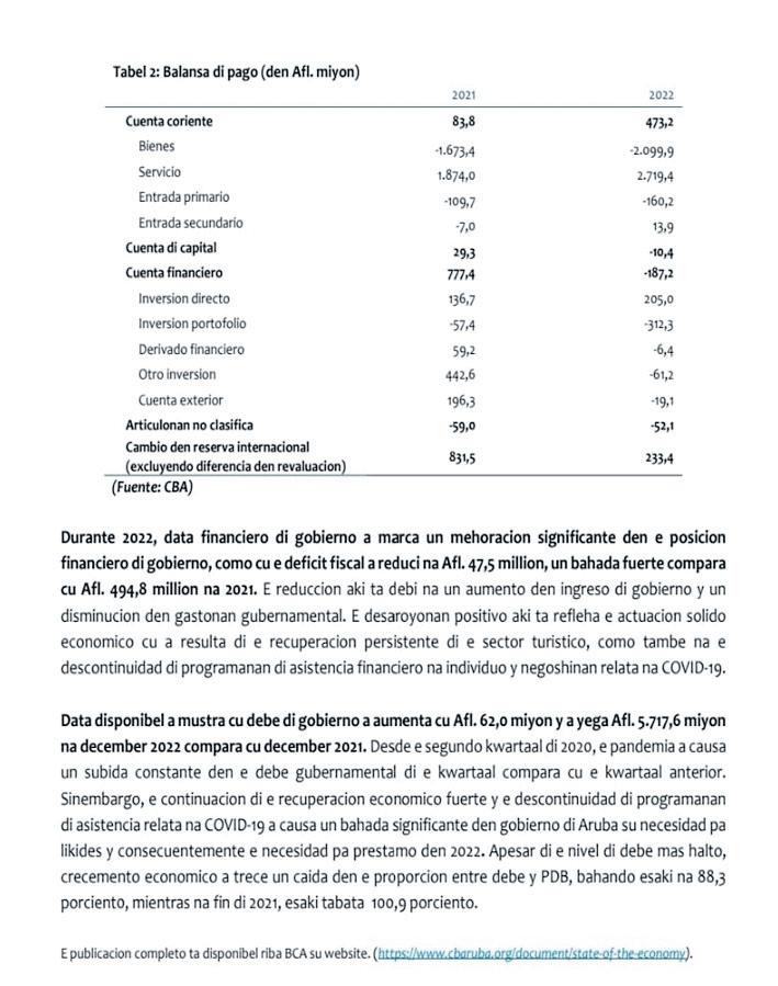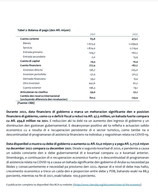 Segun Banco Central di Aruba den su “State of Economy’ cu Gobierno su finansa publico a mehora den aña 2022
