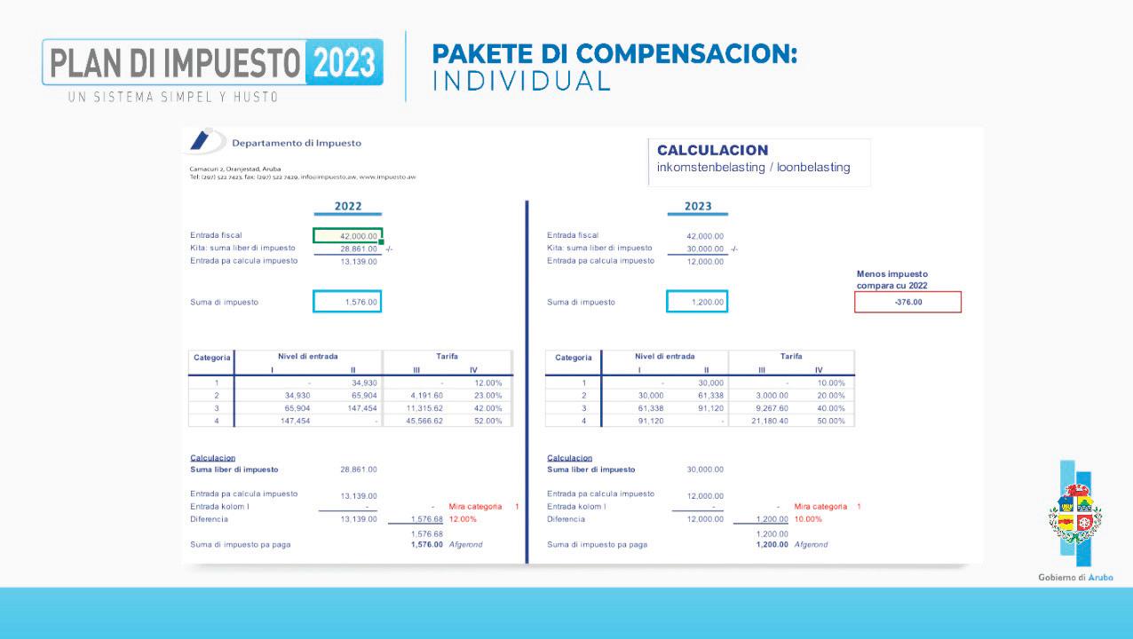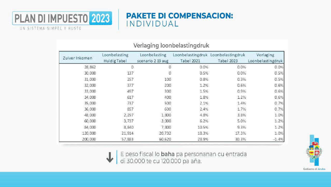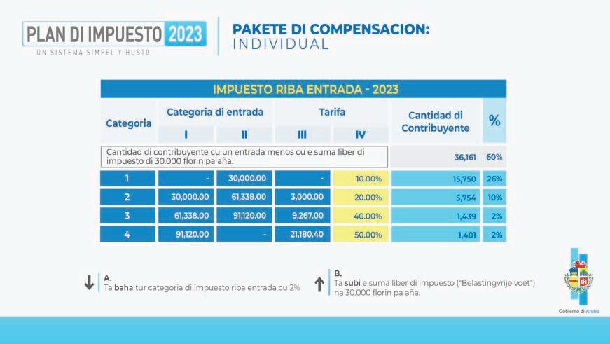 Un grupo grandi di e forsa laboral lo paga menos na impuesto di entrada Cu e cambionan fiscal di compensacion den e 'Plan di Impuesto 2023', bahando tur categoria di impuesto cu 2% y subiendo e suma liber di impuesto na 30.000 florin, un total di 36.161 persona lo no bay paga impuesto riba entrada mas entrante 1 di januari 2023. Esaki ta equivalente na 60% di e forsa laboral di 60.000 persona cu ta haya un