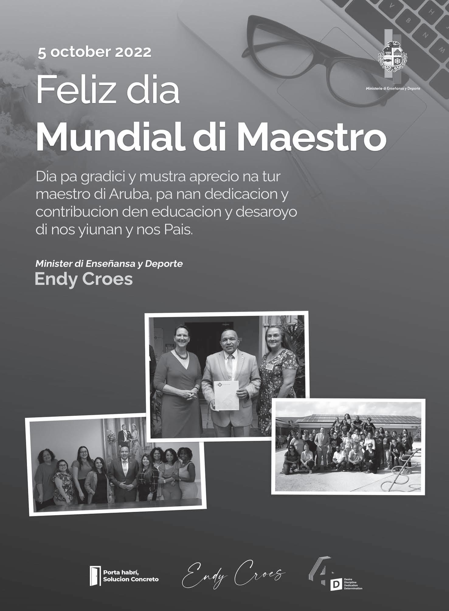 - Diamars mainta, durante un ceremonia ameno, a haci entrega di e cuater stampianan ganado di e concurso di pintamento “Stima Bo Cacho” 2021, cual tabata un concurso, solamente pa scolnan basico. Banda di esaki tambe a haci entrega di premio di e concurso di pinta y kleur “Ley di Cacho” 2022 cu tabata pa basis y kleuter. Durante e evento aki Minister di Husticia y Asuntonan Social Sr. Rocco Tjon conhuntamente cu Minister President di Aruba Sra. Evelyn Wever-Croes, Minister Geoffrey Wever, Minister Endy Croes, y demas Ministers a haci entrega