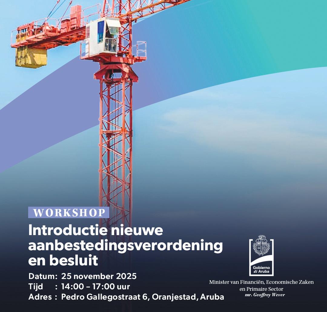 gana e destaho publico; - e ministeriële beschikking (mb) ora di desvia di e procedura di destaho y e motivo manera manera stipula den ley; - e compra di producto, servicio of un trabou adkiri por medio di un destaho cu un valor di Afl. 25.000, of mas; E tayernan ta culmina riba 25 di november di 2pm te cu 5pm na Pedro Gallegostraat 6, cu un tayer cu Minister encarga cu Finansa ta organisa conhunto cu