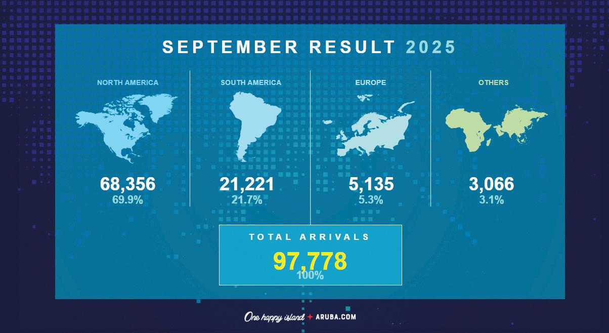 Durante september 2025, Aruba a ricibi un total di 97,778 turista stay-over, representando un crecemento di 2.6% compara cu september 2024. Esaki ta un aumento absoluto di 2,493 bishitante. E aumento mas notabel a bini for di mercado Latino Americano, particularmente Argentina cu un crecemento di 239.6% y Brasil cu 72.8%. For di Norte America, Canada a logra un crecemento fuerte di 14.7%.