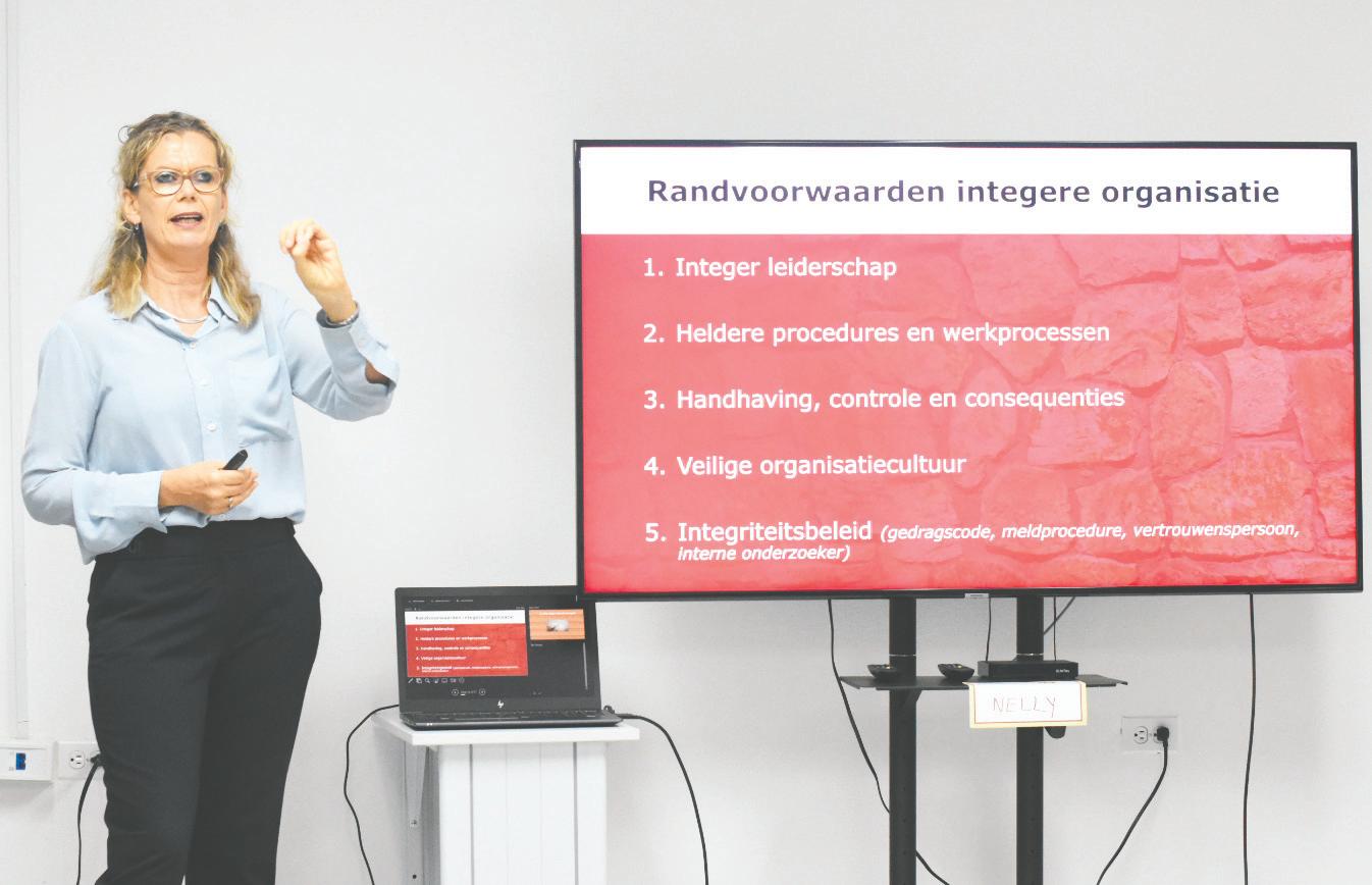 Durante e prome parti di e training a elabora riba caracteristicanan di comportamento humano y na un forma interactivo a duna atencion na e kompas moral encuanto balornan cu ta importante na trabou. Despues a continua riba desaroyo local y internacional riba e tema di integridad y e tarea y ehempel specifico cu tur hefe di departamento tin. Al final a caba e training cu diferente caso practico relaciona cu integridad. E parti di e training aki a duna e participantenan e espacio pa delibera riba posibel solucion y a pone enfasis con por minimalisa e risico di violacion di integridad na pia di trabou.