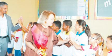 Oranjestad, Diabierna mainta Prome Minister Evelyn Wever-Croes hunto cu Parlamentario Alvin Molina, a bishita St. Paulus School na San Nicolas pa mira con e docente y alumnonan ta duna y haña les cu e "chromebooks" nobo cu nan a gana cu e proyecto di Edutech.