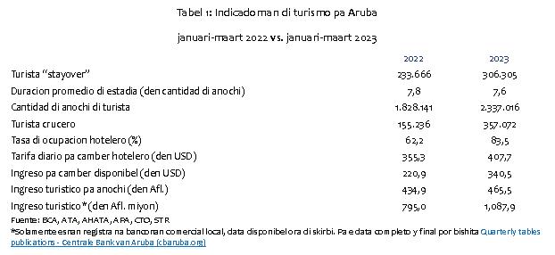 Den e prome kwartaal di 2023, e Producto Domestico Bruto (PDB) estima pa BCA a crece cu 3,1 porciento, debi na e rendimento robusto y continuo den e sector turistico. Durante e periodo di analisis, mayoria di e indicadornan turistico a mustra un mehoracion compara cu e mesun periodo di 2022 (Tabel 1). Un expansion di 31,1 porciento den bishitante “stayover” a conduci na un aumento di 27,8 porciento den e cantidad di anochi cu turistanan a keda, aunke tabata tin un caida den e promedio di estadia (intenciona) di turistanan. E industria hotelero tambe a raporta resultado positivo. Grado di ocupacion (+21,3 punto di porcentahe) y tarifa pa camber (+ 14,7 porciento) a subi compara cu e prome kwartaal di 2022. Consecuentemente, ingreso pa camber a expande cu 54,2 porciento. Siguiendo e desaroyonan ya menciona, ingreso turistico a subi cu 36,8 porciento den e prome kwartaal di 2023.