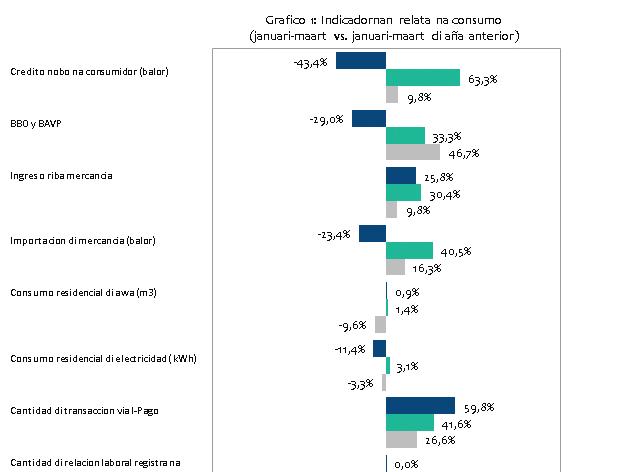 Consumo priva den termino real, pusha pa e demanda domestico pa bienes y servicio, tambe a contribui na crecemento economico real. Durante e prome kwartaal di 2023, indicadornan relata na consumo a mustra un panorama positivo di actividad economico compara cu e
