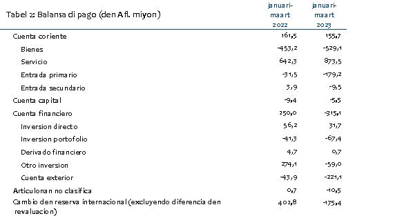 Transaccionnan internacional registra via banconan comercial a ocasiona un salida netto di divisa di Afl. 175,4 miyon durante e prome tres lunanan di 2023 (Tabel 2). E cuenta financiero a primordialmente causa e resultado aki, como cu ta observa un salida netto di divisa den e cuenta aki