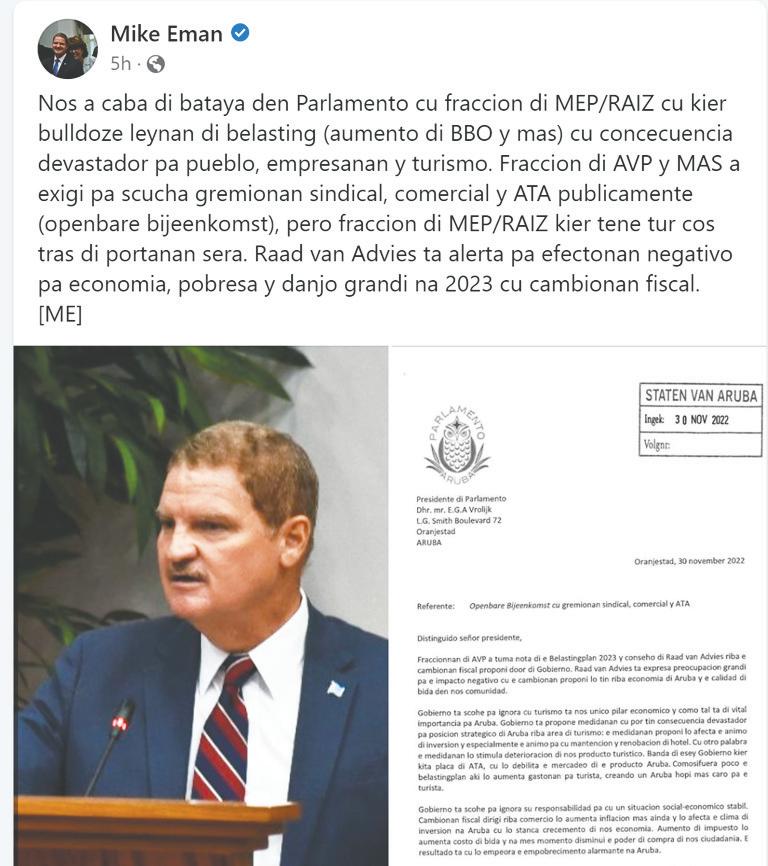 Fraccion di AVP den Par lamento di Aruba a en trega un peticion pa un reunion publico (openbare bijeenkomst) cu gremi onan sindical, comercial y ATA pa asina atende cu e tema di e cambionan fis cal presenta pa Gobierno. Ayera Gobierno a presenta na Parlamento di Aruba un pakete di medida, dis frasa na reforma fiscal pa e ana 2023. Pa anja 2023 nos comunidad lo wordo sacudi cu un pakete di medida, cu lo bay tin un impacto negativo den tur sector di nos comunidad. E perspectiva socio-eco nomico pa e anja 2023 a wordo ainda mas empeora cu e anuncio di e cambion an fiscal cu ta condena nos comunidad na un calidad di bida inferior.