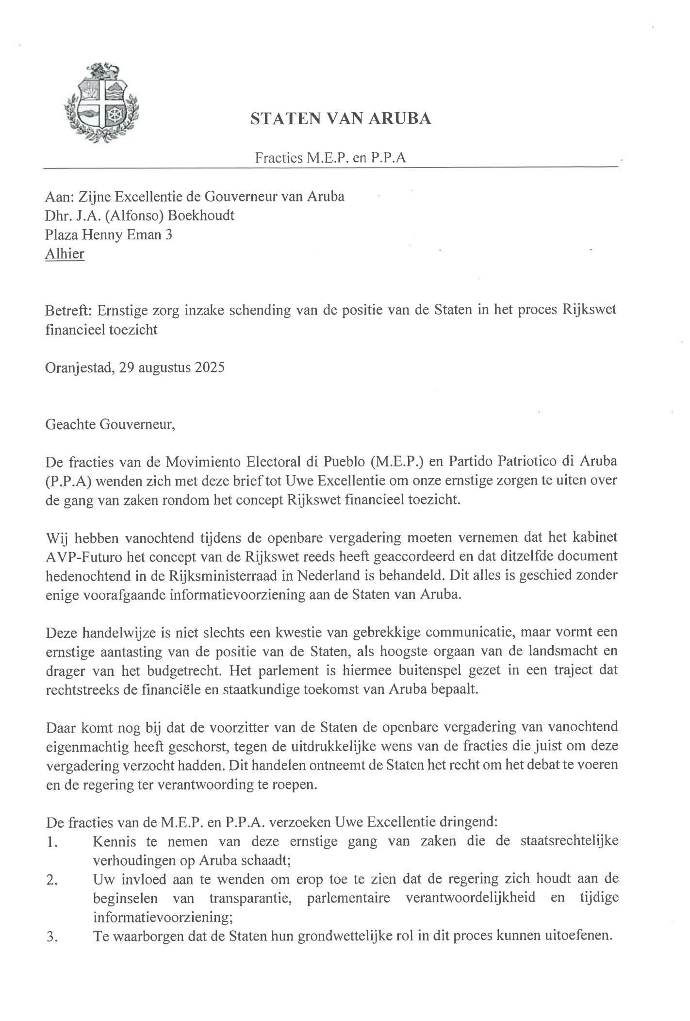 Pa e motibo aki Fraccion di MEP y PPA a bay entrega un carta na Gabinete di Gobernador, pa su intermediacion pa salbaguardia democracia di Aruba.