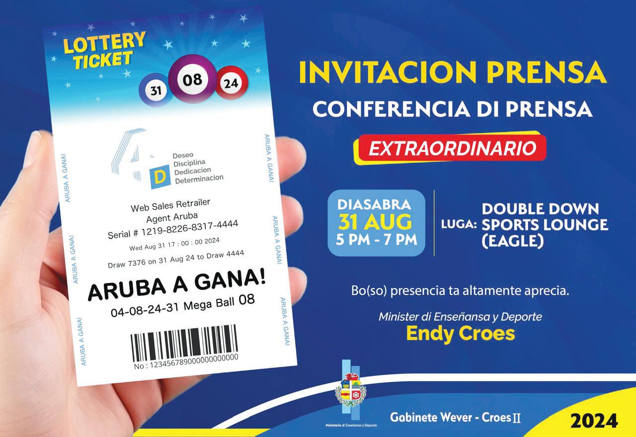 Pueblo di Aruba ta cordialmente invita pa sintonisa Conferencia di Prensa Extraordinario di Minister di Enseñansa y Deporte Endy Croes, en conexion cu un noticia importante pa Aruba. Keda pendiente pa e anuncio oficial 5 or di tardi, a traves di Canal 22, TeleAruba, Facebook di Gabinete Wever Croes y Minister Endy Croes. Aruba a gana!
