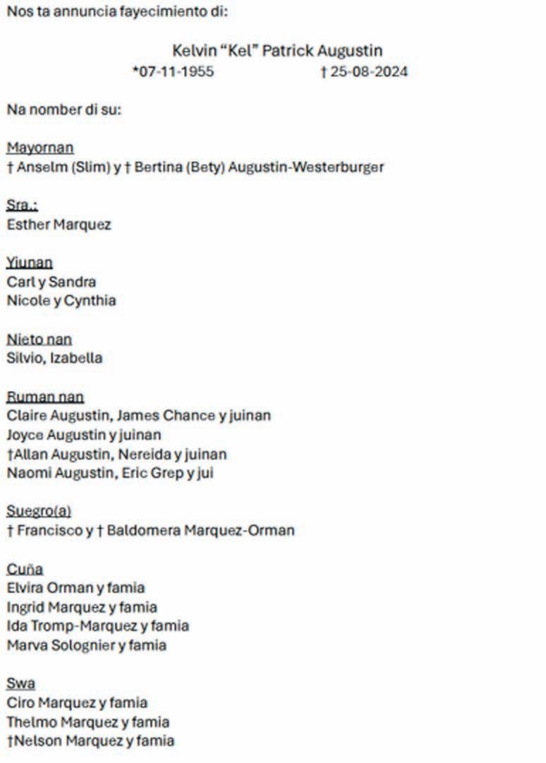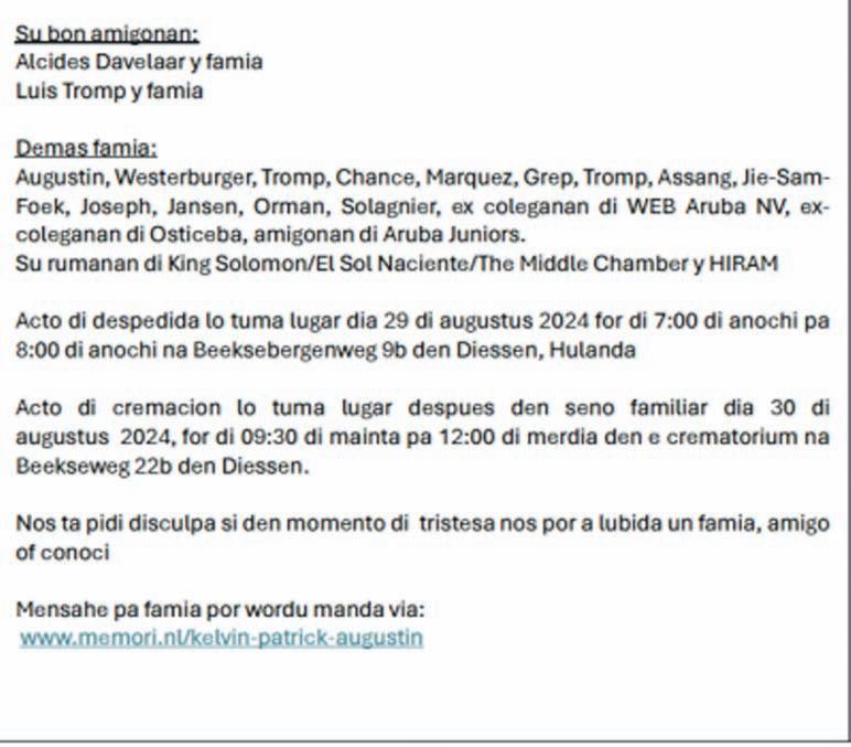Grupo di nobena y Cas di Oracion “Cu Confiansa y Fe den Señor de Los Milagros di Buga” bou guia di Filomena Croes - Krozendijk , Glenda y Shon Pe Krozendijk y nos lidernan Spiritual Reverendo Pastoor Jozef Pelc y Reverendo Diacono Sr. Michael Nicolaas ta invita tur fiel deboto, parokianonan y pueblo di Aruba en general pa asisti na nos di 19 aña di nobena na honor di Señor de Los Milagros di Buga y Mama Maria Dolorosa na Misa di La Birgen di Fatima na Dakota.