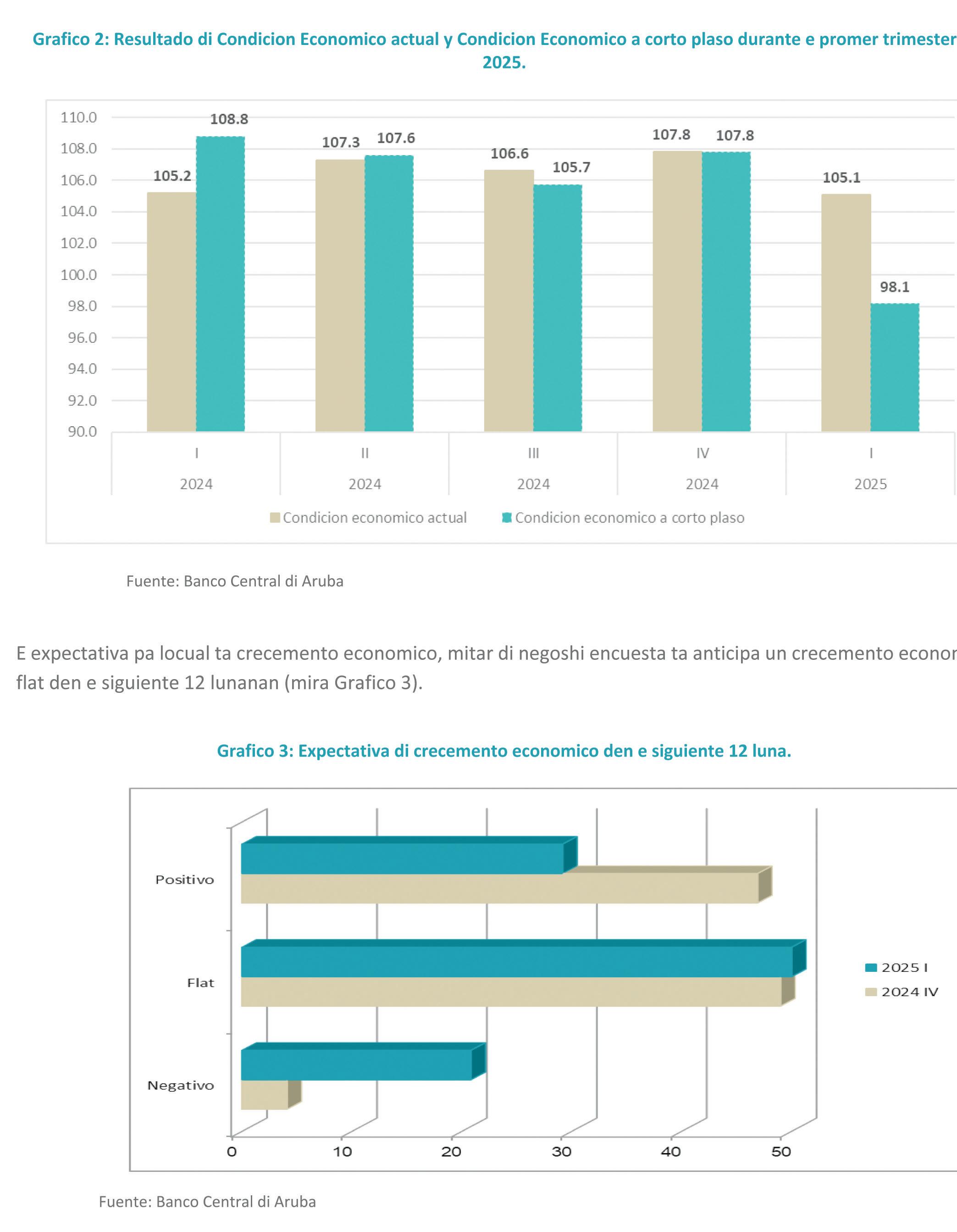 Durante e promer trimester di 2025, e porcentahe di negoshi encuesta indicando “ningun cambio” den empleo a subi cu 15,4 punto di porcentahe te na 52,1%. E porcentahe di negoshi encuesta cu a raporta un “ganashi” a subi cu 12,2 punto di porcentahe te na 93,8% den e promer trimester di 2025. E porcentahe di negoshi encuesta indicando “mehoracion” den e condicion economico actual di inversion a baha cu 7,5 punto di porcentahe te na 35,4% den e promer trimester di 2025. Encuanto condicion economico a largo plaso pa e siguiente 12 lunanan, 43,8% ta anticipa cu e tasa di inflacion lo ta mas cu 3% den e promer trimester di 2025.