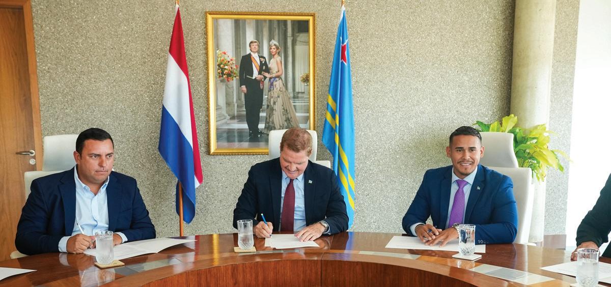 Cu e compromiso mutuo pa e bon comun, sostenibilidad y bienestar di pueblo Arubano, Gobierno di Aruba y e stakeholdernan presente, a acorda pa establece un compromiso comparti pa participa den un proceso structura di dialogo y colaboracion, cu e obhetivo pa desaroya maneho, acuerdo y iniciativa conhunto pa sigura un caminda mas sostenibel pa futuro di turismo na Aruba. Esnan cu a firma e MOU ta Prome Minister Eman, Sra. Tisa LaSorte Henriquez di AHATA, Sr. Alex Cybul di VPRA, Sra. Ronella Croes di ATA, Sr. Jurgen Benschop di Triple A y Sr. Bruce Franken di APA y Sra. Cindy Ruittemanz di Association of Aruba Realtors