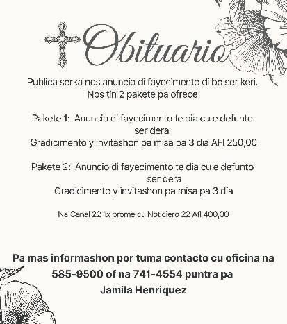 Ta invita pa condolencia y acto di entierro cu lo tuma lugar dia 26 di augustus 2023 for di 9.00 am pa 11.00 am na Royal Funeral Home y despues saliendo pa santana catolico de Vries na Santa Cruz.