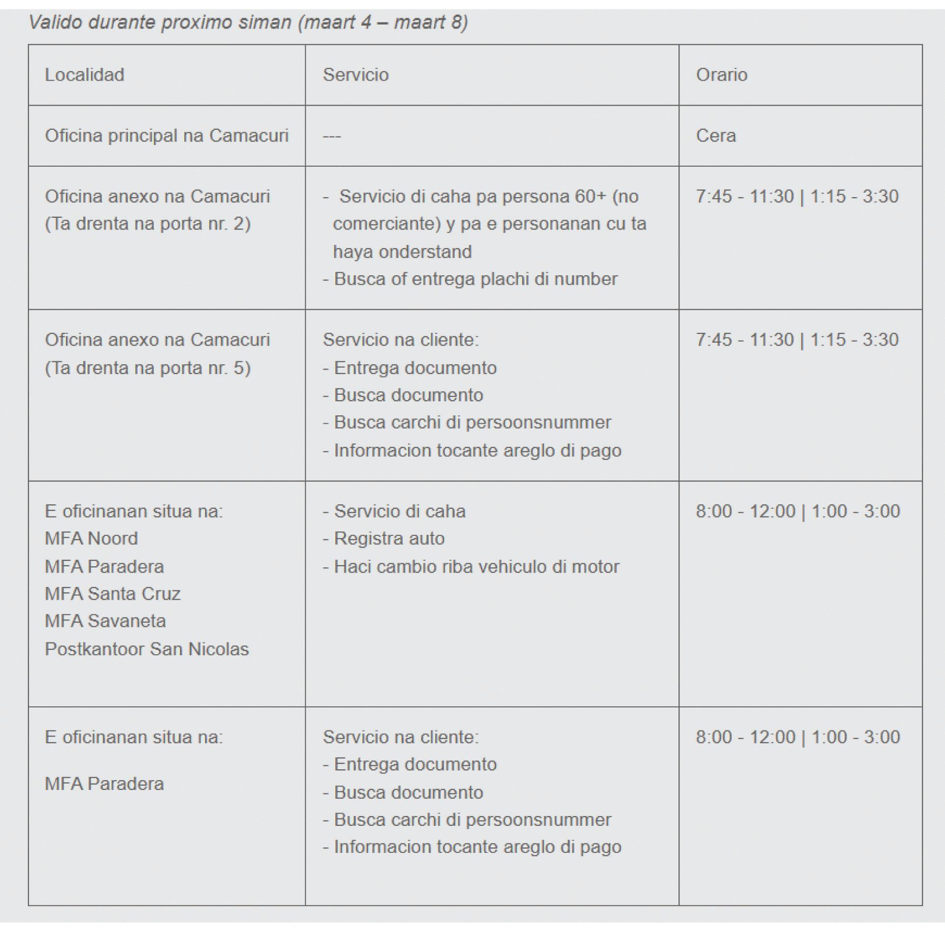 – Departamento di Impuesto ta haci un cambio temporal di localidad pa cu servicio publico. Esaki ta debi na trabounan di mantencion necesario na oficina principal na Camacuri. Mientrastanto Departamento di Impuesto kier sigura cu ta sigui brinda servicio na publico sin interupcion. Siguientemente ta sigui un skema di e localidadnan cu lo keda activa durante e proximo siman.