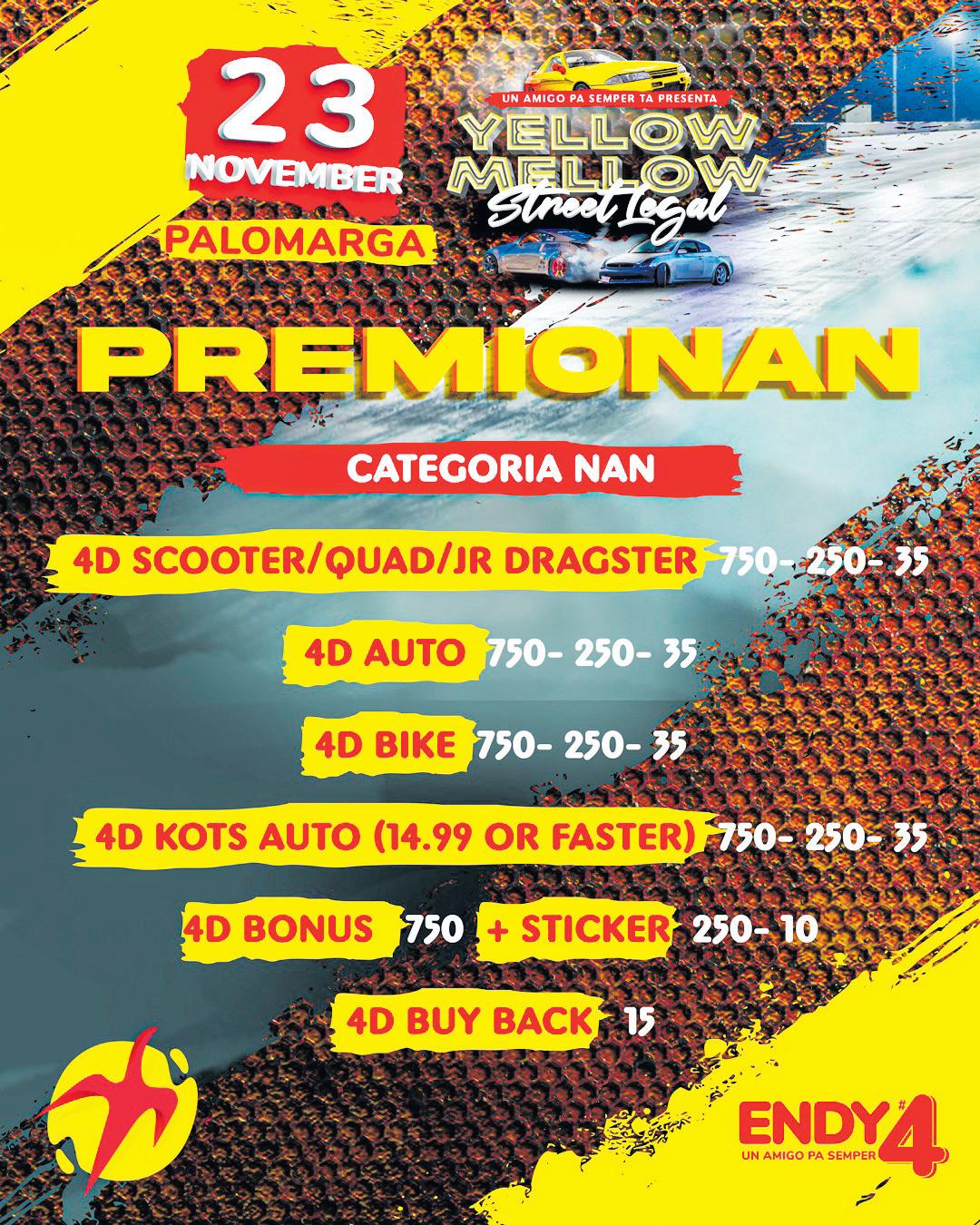 Pa finalisa, ta pidi e coredonan di e prome categoria pa ta presente pa 4 pm ya cu e careda ta inicia pa 5 pm en punto. “Danki na tur cu a inscribi pa participa den e Yellow Mellow Street Legal” Endy Croes a subraya.