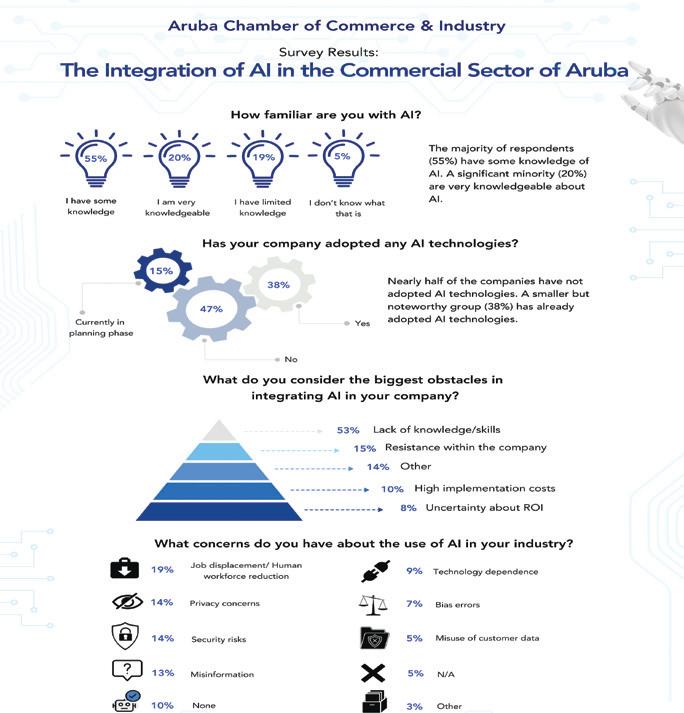 Mas cu mita di e empresarionan ta indica cu falta di conocemento/ habilidadnan (53%) ta e obstaculo mas grandi pa incorpora AI. Sinembargo, e gran mayoria (81%) ta indica cu no mester asistencia of ayudo pa implementa AI den nan operacionnan. Otro desafionan significante ta resistencia interno (15%) y costo halto di implementacion (10%). Ademas, e preocupacionnan mas grandi riba e uzo di AI den comercio ta un reduccion den e forza laboral humano (19%), privacidad (14%), y falta di informacion (13%). Alabes, solamente 46% ta consciente di e risiconan cu ta wordo asocia cu AI.