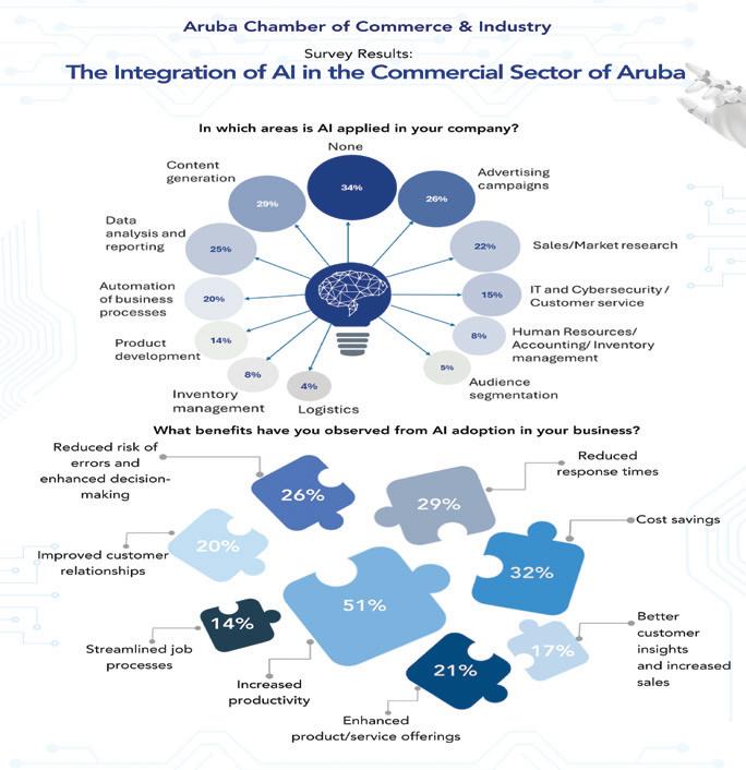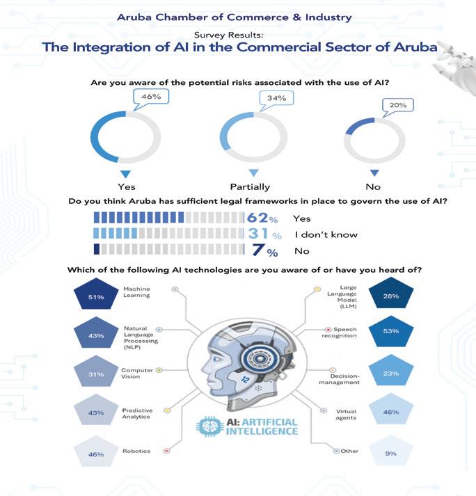 Aruba, ta presenta un resumen di e encuesta relaciona cu e familiaridad y implementacion di Inteligencia Artificial (AI) den e sector comercial na Aruba. E meta di e encuesta aki tawata pa haña un bista riba e conocemento y uzo responsabel di AI den sector comercial pa fungi como base pa monitoria e desaroyonan riba e tereno di transformacion digital y AI den un contexto mas amplio. E resultadonan ta mustra diferente nivel di conocemento, implementacion y preocupacionnan cu empresarionan ta enfrenta den nan intento pa adapta AI den nan operacionnan. Alabes, e ta duna un indicacion riba e uzo actual di AI, su beneficionan, su retonan y e miedo encuanto e implementacion di AI den comercio na Aruba.