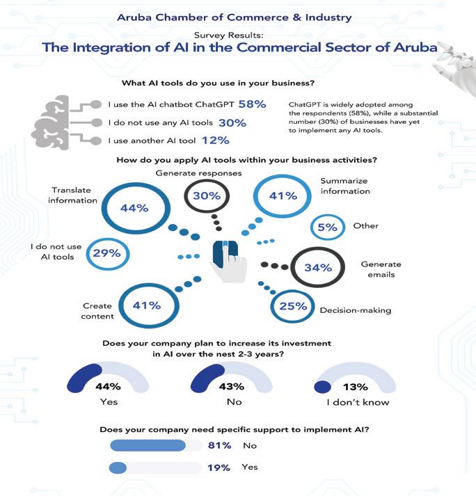 AI ta presenta un oportunidad unico pa transformacion den sector comercial di Aruba. Complementando e resultadonan di e encuesta, ta referi na e graficonan anexo cu tambe ta disponibel riba e website di KvK. KvK ta comprometi pa sigui guia empresarionan riba e caminda pa digitalisacion y inovacion. KvK lo introduci mas programa educativo y workshopnan pa guia empresarionan den nan proceso pa implementa AI den nan negoshi. Di e manera aki, lo sigura cu negoshinan local por ta competitivo den un mercado global, mientras cu nan ta transforma nan operacionnan pa asina aporta na desaroyo di nos economia.