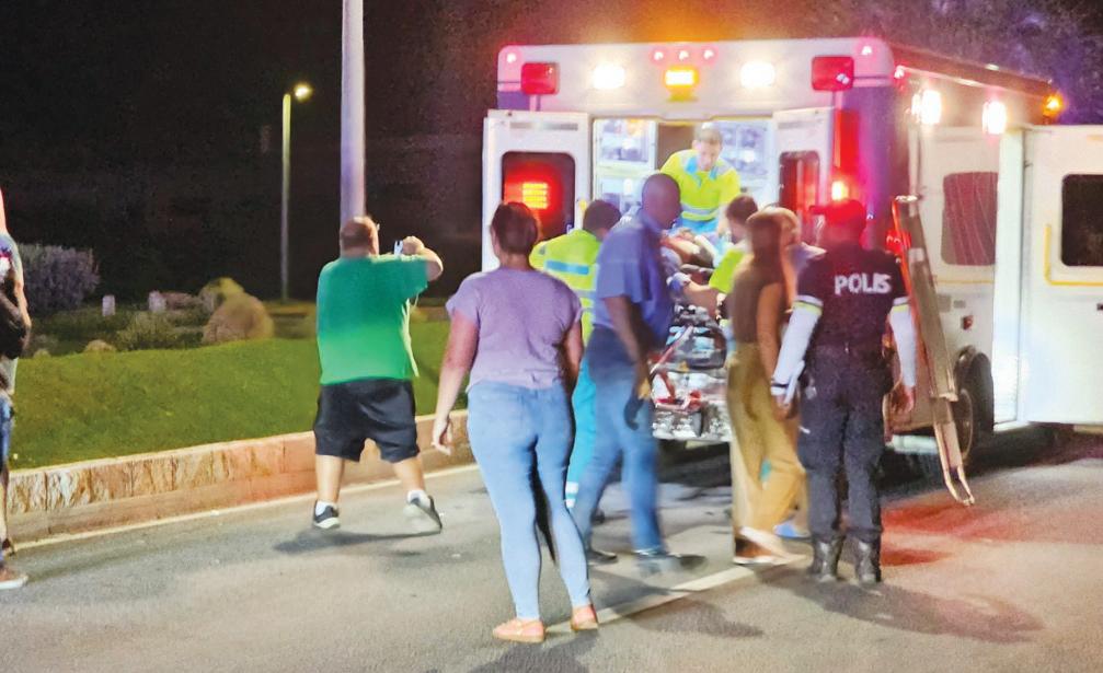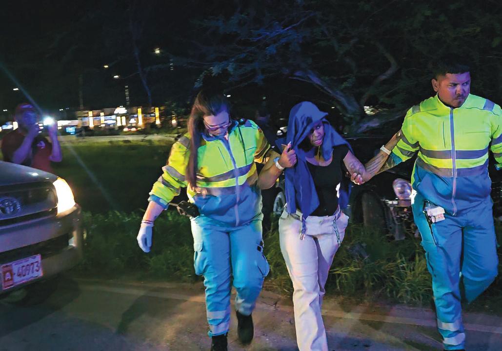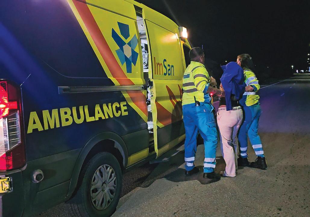 Paramediconan na e sitio mesora a drenta den accion y a lanta e dama pa transporte direccion Hospitaal.