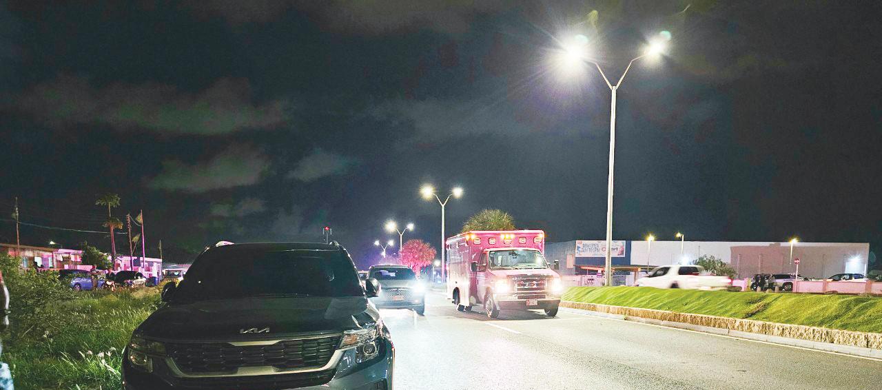 Ambulance tambe a yega y ariba caminda esun cu ta bay zuid un dama ariba caminda drumi. Banda pabou di caminda un auto KIA suv.
