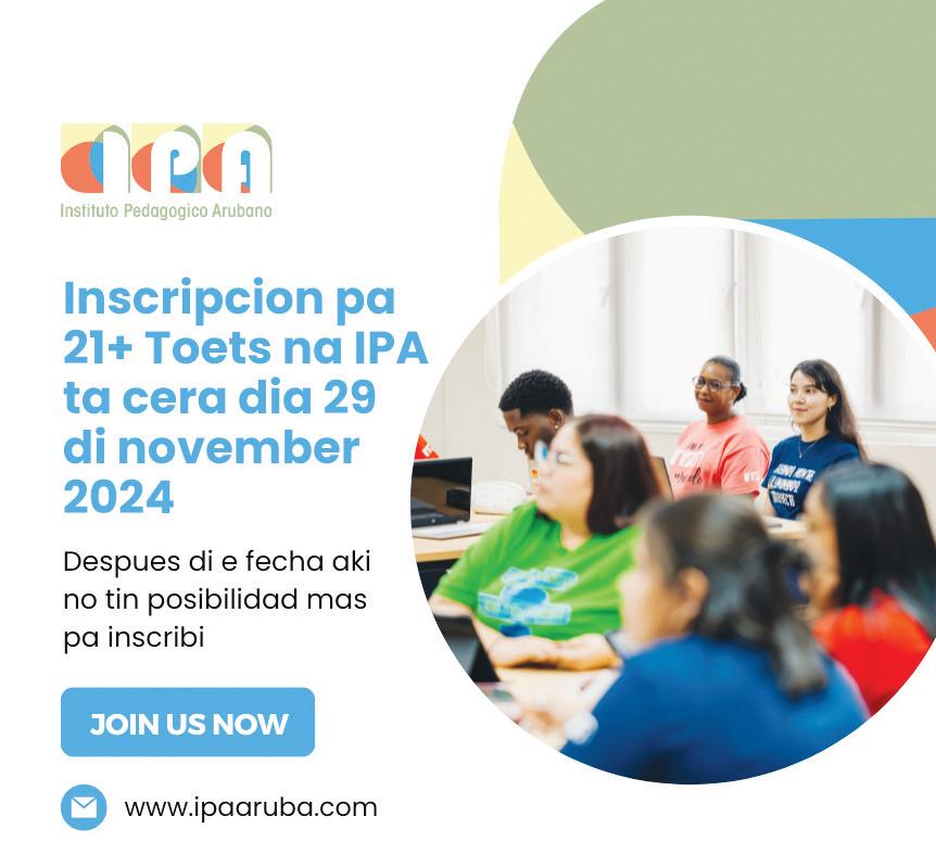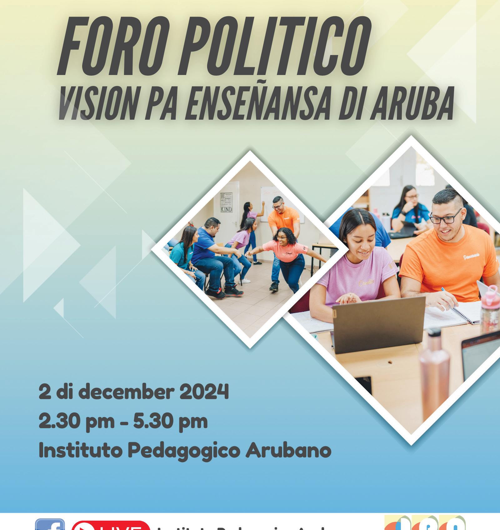 Instituto Pedagogico Arubano (IPA) ta invita comunidad di Aruba pa sintonisa e Foro Politico organisa pa IPA. E foro lo tuma luga dialuna dia 2 di december 2024 pa 2:30 pm, en bibo via di pagina di Facebook di Instituto Pedagogico Arubano.