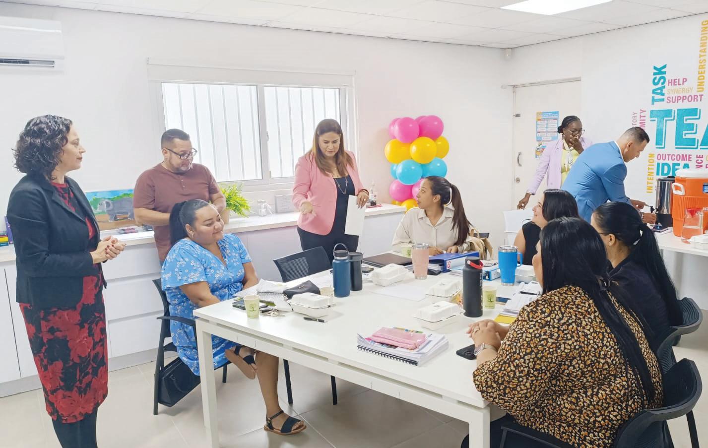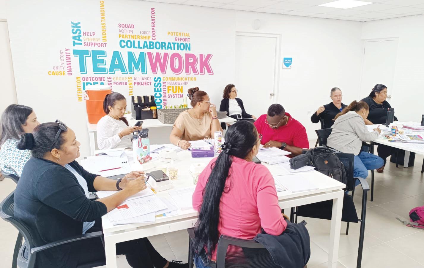 Zoraima Wever - Charlène Marchena- Nisagnerja Mathilda - Seever Krozendijk - Delmary Laclé representando Stichting EPB, sigui pa Mary-Ann Kock di DVG/ JGZ, Jerrely Franca di Little Smiles Clinic (sector priva), Audrey Kan di Aruba Clinical Services (sector priva), Rosalina Croes di Bureau Traimerdia, Shennelyn Croes di Fundacion RespetaMi, Desré Mathew di Korps Politie Aruba (KPA) y Christel Choennie di IMSAN.